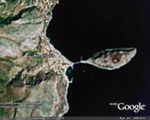 Die N. Monemvasia ist ein 300 m hoher Felsen vor der Ostküste des Peloponnes. Die Insel hat eine lange Besiedelungsgeschichte, die Glanzzeit erlebte sie in byzantinischer Zeit. Heute bestehen 3 Siedlungsteile: