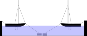 Wichtig ist es auch möglichst mittig durch die Gasse zu fahren. Das verringert die Gefahrt mit dem Schiff in die stramm gespannten Mooringleinen oder Ankerketten zu gelangen (siehe Bild).