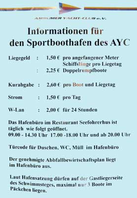 Liegegelder Gastlieger: pro angef. lfm 1,50 €, WLAN frei, Strom pro Tag 2,00 €, Kurtaxe 2,60 € pro Boot