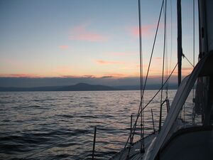 Gegen Abend wurde es dann Zeit, in den Sound of Islay einzufahren. Für mich als alten Adria-Segler war diese Nacht "most impressive". Wir segelten bei völliger Dunkelheit, bei 4-5 Bft. mit bis zu 10kn SOG (davon 2-3kn Tidenstrom) durch ein relativ enges Fahrwasser. Richard –als "Yachtmaster-Instructor" der RYA- nahm das nicht nur absolut cool, sondern überließ uns auch die gesamte Navigation und beschränkte sich auf einige notwendige Korrekturen. Auf der Insel Jura an Steuerbord zeichneten sich gegen den klaren Sternenhimmel zwei rundliche Hügel ab. Richard: "These are the Tapps of Jura". Ich hatte zwar schon einen Verdacht, musste aber doch fragen, was Tapps seien. Er sagte: "They look like a woman's breast". Der Sound of Iona war wieder ein "Tidal Gate", diesmal weniger wegen der Strömung, sondern wegen der Wassertiefe. Es fügte sich aber problemlos in den weiteren Fahrtverlauf ein. Schon lange hatte ich davon geträumt, einmal das berühmte keltisch-christliche Kloster auf Iona [1]und die bekannten Basalthöhlen von Staffa [2]zu besuchen. Dass ich einmal nachts daran vorbeisegeln würde, ohne die Inseln zu betreten, hätte ich nicht gedacht. Dafür wurden wir durch wunderbares Segeln und einen einmaligen Blick auf die Milchstraße entschädigt. Am Ende der Wache hatte ich kaum Lust, mich in die Koje zu legen, aber ein paar Stunden Schlaf mussten einfach sein. Als ich wieder wach wurde, lagen wir in Tobermory auf der Insel Mull (nicht verwechseln mit dem Mull of Kintyre) am Steg und die Sonne beleuchtete die bunten Häuser am Hafen. Da war eine kleine Shoppingtour einfach fällig und wir kauften Whisky und aßen die unvermeidlichen Fish and Chips, wobei ich mich auf Scallops (Jacobsmuscheln) verlegte, die wirklich sehr lecker waren. Die werden dort von Tauchern in Handarbeit gesammelt, wie wir mehrfach beobachten konnten.