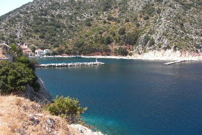 Tief eingeschnittene Felsbucht mit kleinem Sandstrand am Südende von Ithaka, ideal für Badepausen. Gut haltender Sandgrund.