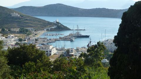 2015 Der eigentliche Gastanleger ist die südliche Mole, bei der man mit Buganker und Heck anlegt. Dieser Platz ist allerdings bei Meltemi sehr ungemütlich, da man dem Meltremi voll ausgesetzt ist und auch starker Wellengang auftritt. Es gibt Wasser und Strom mit Checkkarte, die man in dem kleinen Pavillion gegenüber am Fähranleger erwerben kann. Im inneren des kleinen Hafens gibt es Mooringleinen, der Platz ist aber in der Regel von einheimischen Booten belegt. Etwas besser liegt man bei Starkwind an der östlichen Mole. Hier gibt es einige Mooringleinen, aber man wird auch Anker benutzen müssen. Die in anderen Hafenführern erwähnte Markierung der Mooringverankerung (Kette) ist nicht mehr auszumachen. Den besten Schutz vor Meltemi hat man an der nördlichen Mole direkt bei der Restaurant-Meile. Hier liegt man im Wind- und Wellenschatten. Wenn dann noch eine Mega-Yacht anlegt (siehe Bild), liegt man geschützt wie in einem Hallenbad. Wie die gelben Markierungen zu verstehen sind, haben wir nicht erfahren können. Anscheinend sind diese Plätze nur zur Übernachtung gedacht, denn tagsüber lag hier kein Schiff. Die neuen Fähren (vorwiegend Katamaran Fähren) scheinen nicht mehr so starken Schwell zu erzeugen, zumindest haben wir nichts bemerkt. Im Ort gibt es jede Menge Tavernen und auch Supermärkte. Liegegebühren zahlten wir für eine 40 Bavaria 2,39€ / Nacht (Juni 2015). [1]