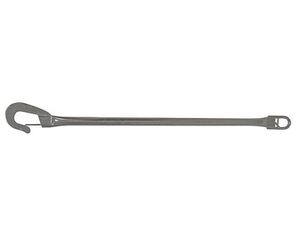 Haken mit Stiftsicherung - Klauenhaken: Kräftiger Haken mit einer Bolzensicherung. Der Bolzen muss beim Einhaken gegen Federzug offen gehalten werden. Die Bojenleine ist nicht am (oberen) Hakenende angespleisst, sondern direkt unten an der Klaue. Keine Zugbelastung auf den Hakenstock.