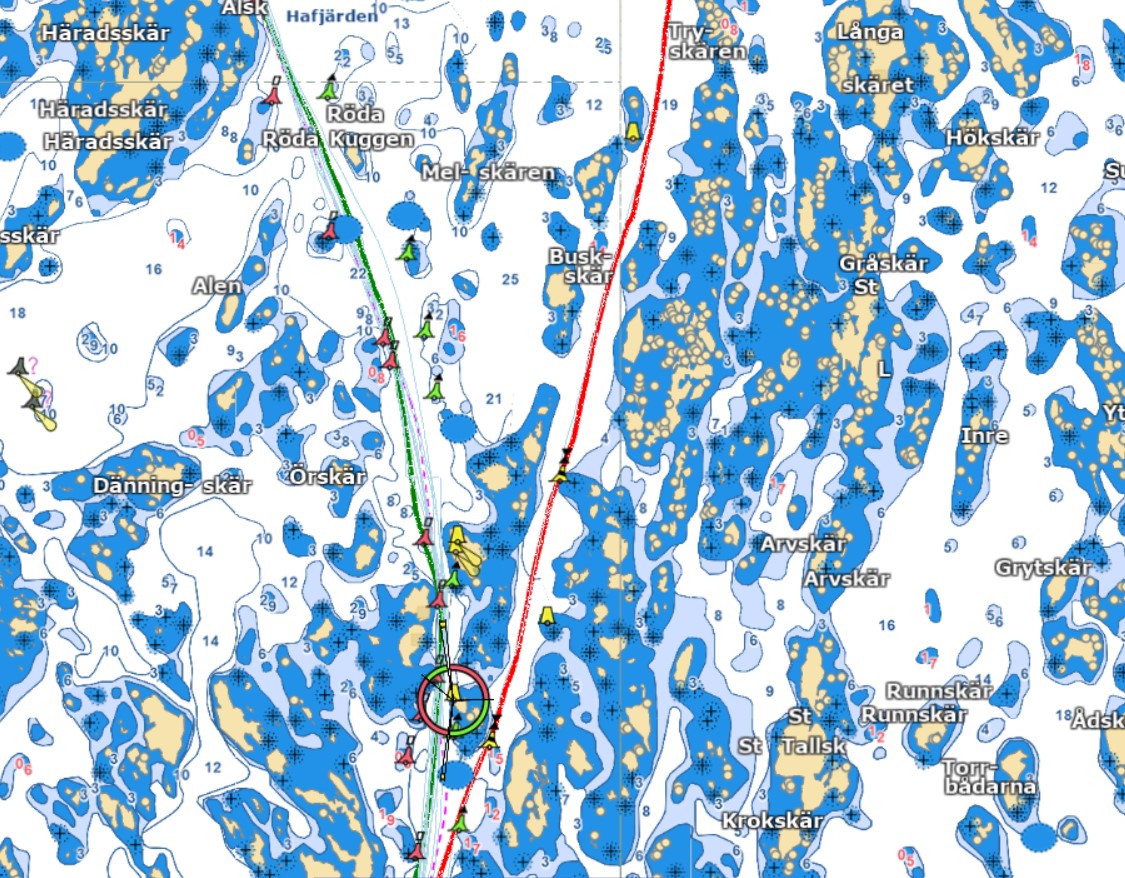 Die eingezeichnete grüne Route ist das Hauptfahrwasser im Aspöfjärden, die östlichere rote Route ist der Kronleden. Das Wasser dort ist tief und rein und ohne Überraschungen. Die Orientierung fällt anhand der zahlreichen Baken an Land leicht.