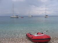 Dort ist aufgrund von Felsen im Wasser Platz für nur eine Yacht. Es kann auf gutem Ankergrund (Sand) mit Landleine vor einem der Überwasser-Felsen östlich der Mittellinie der Bucht geankert werden. Tiefe ca. 3 - 5m, Ankertiefe ca. 8 - 15 Meter. Die Bucht ist nach Süden völlig offen und daher nur bei nördlichen Winden zu empfehlen. Auch dann sorgen allerdings die Bugwellen der diversen Fähren nach Patras für merklichen Seegang. Beim Schwimmen oder Paddelboard-Fahren nahe der Felsen und Felswand ist daher Vorsicht geboten. [2]