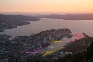 - Fløyen - Eine Standseilbahn fährt unweit vom Hafen Vågen auf den Hügel nördlich von Bergen. Von oben bekommt man eine schöne Aussicht auf Bergen und den Hafen (kleiner Ausschnitt davon siehe Foto). Die Bahn fährt bis 23:00 Uhr. Die Fahrt kostet 95 NOK hin- und zurück.