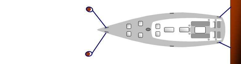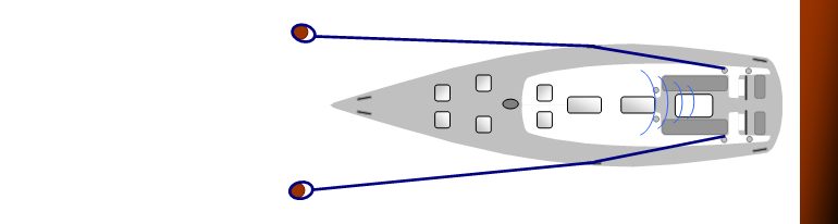 Abschließend können nun die beiden Mittelsprings zu Achterleinen umgelegt werden, dazu wird das Gas herausgenommen oder sogar in Rückfährtsfahrt umgesteuert. Alternativ können auch schon vorher zusätzliche unabhängige Achterleinen lose ausgebracht und nun stramm geholt werden.