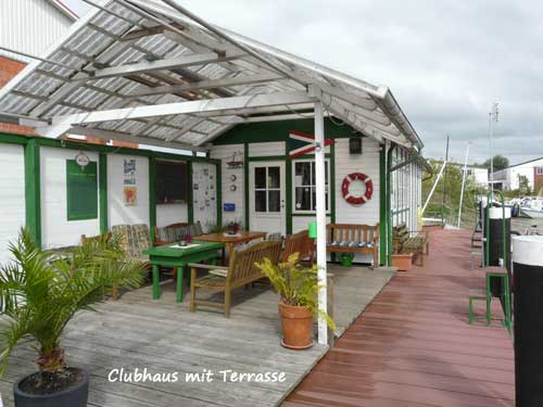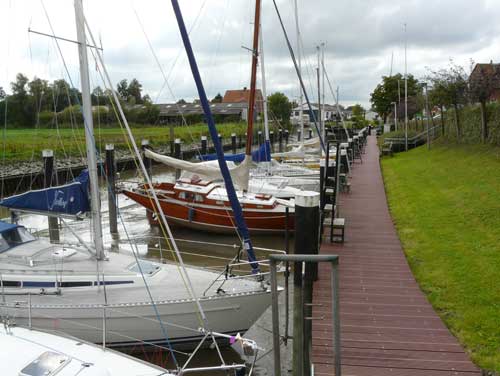 Am toten Ende des Hafens steht an Land neuerding ein Ausflugs-Cafe, von dem sich ein erholsamer Blick über den Hafenpriel bietet.