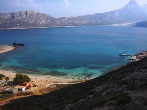 Der Strand bzw. die Sandbucht von Balos bildet die letzte Landverbindung zwischen der (Halbinsel) Kher. Gramvousa und der Kher. Tigani. Letztere grenzt diesen Bereich des O. Gramvousa gegen S und W ab.
