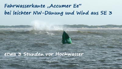 Das Seegatt Accumer Ee ist meist hinreichend tief und gut betonnt. Bei starkem Wind und insbesondere bei Wind gegen Strom kann es aber schnell unbefahrbar werden. Bei gutem Wetter kann man über See gut Helgoland (knapp 38 sm) oder viele andere Ziele erreichen.