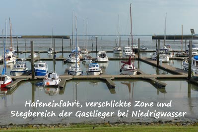 2019 ist der Sportboothafen bei Niedrigwasser de facto trockengefallen, was aber bei dem weichen Schlick kein Problem ist. Wie auf der Skizze ersichtlich ist, sollten auf keinen Fall die alten "historischen" Holzpfähle mit Pricken verwechselt werden. Die Pfähle stehen im Flachen.