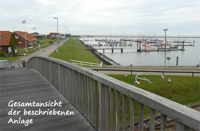Etwa in Linie der Einfahrt liegt die Brücke des WSA; an ihrer Nordostseite kann man festmachen, hier finden größere Boote auch bei NW meist genug Wasser.