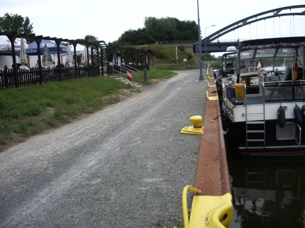 Liegestelle der Berufsschifffahrt, am östlichen Ende Plätze für Sportboote. Sind diese Plätze belegt, kann man auch am westlichen Ende der Liegestelle anlegen. Von beiden Liegestellen gelangt man schnell über Kanalbrücken in den Ortskern, dort gibt es vielfältige Einkaufsmöglichkeiten.