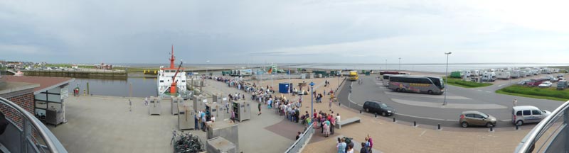 ![]() v.l.n.r. Badebetrieb und Camping - Fähre nach Spiekeroog - Gepäckcontainer und Warteschlange - Busparkplatz - PKW und Wohnmobil-Stellplätze |