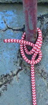 | Nun führt man das lose Ende noch einmal durch den Ring oder um die Stange. Es sind anderthalb Rundtörn entstanden. | |