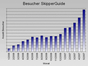 Das Web-Projekt SkipperGuide kann sich zunehmender Beliebtheit erfreuen, wie die Zugriffszahlen belegen. Vor etwa 1.5 Jahren wurde das Projekt ins Leben gerufen und kann seit dem ein kontinuierliches Wachstum verzeichnen. Dank zahlreicher Autoren sind für einige Segelreviere bereits umfassende, aktuelle Informationen verfügbar. Dass das Schreiben nicht nur Selbstzweck ist, sondern Nutzen schafft und auch eine große Zahl Leser findet, ist an der wachsenden Zahl von Seitenabrufen erkennbar. Mittlerweile benutzen täglich etwa 200 Menschen SkipperGuide, weit über 500 Artikel wurden bereits verfasst.
