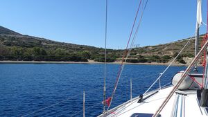 Im Ormos Eriston, der nach Westen offen ist, herrscht leider meist ein erheblicher Schwell, da auch der Grund zum Ufer hin sehr langsam sandig ausläuft ist das sehr schaukelig. Besser ankert man in der Nordwest-Ecke bei vier bis acht Metern auf Sand mit Felsen, windgeschützt. Es kann dennoch ziemlicher Schwell einlaufen, wenn der Meltemi stark ist oder ein eher westlicher Wind steht.