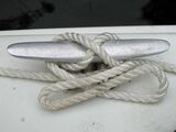 | | |In unserem Beispiel führt die stehende Part waagerecht nach links aus dem Bild. Als erstes bildet man mit dem losen Ende einen Rundtörn um die Klampe. Mehr als ein Törn empfiehlt sich in der Regel nicht wegen möglicher Überläufer. | ||