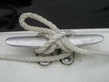 | | |Nun führt man die lose Part über Kreuz über die Klampe und um die Hörner, bis man genügend Reibung hat, um das Ausrauschen der Leine zu kontrollieren. Meist reichen eine (wie im Beispiel) bis zwei Lagen. | ||