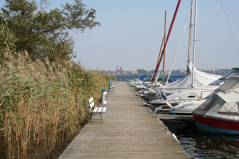 Steg der Müritz-Marina mit Blick auf die Warener Altstadt von der Müritzseite