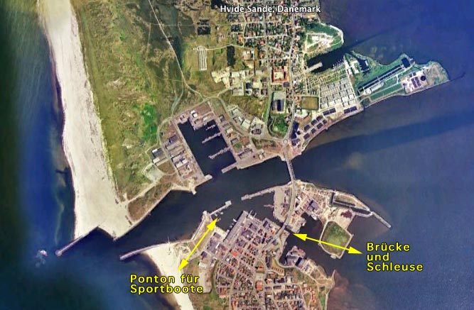 Die Zufahrt von der Nordsee ist durch gute Betonnung und zwischen den schützenden Einfahrtsmolen problemlos möglich.<br /> | Die Zufahrt von der Nordsee ist durch gute Betonnung und zwischen den schützenden Einfahrtsmolen problemlos möglich.<br /> | ||
