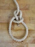 |Man legt das lose Ende um die stehende Part, steckt es wieder von oben in die Schlaufe (nicht Auge!) und um das Seil herum. Nun führt man das Ende parallel zu Schlaufenpart und Auge zwischen stehender und loser Part durch. | |||