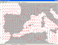 Links sieht man ein GRIB-File des Westlichen Mittelmeers vom 25.11.2007 in der Darstellung mit ViewFax. Das Beispiel zeigt eine typische Mistral-Wetterlage im Golf von Lyon mit Windgeschwindigkeiten bis 35kn. Die Isobaren werden durch graue Linien dargestellt. Führt man den Cursor über die Grafik, erscheinen in der Fußzeile zu jedem Punkt die Werte für Luftdruck und Lufttemperatur. In der Menuezeile oben kann man die nächsten 12,24,36,48 oder 72 Stunden anklicken. Entsprechend öffnen sich die dazugehörigen Grafiken mit den jeweiligen Werten.