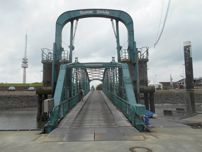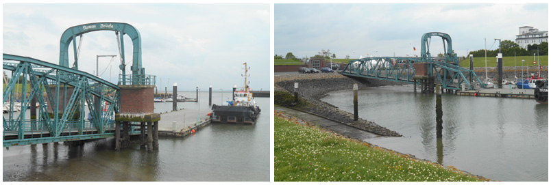 |[[Bild:KWBruecke.jpg|framed|left|Die Kaiser-Wilhelm-Brücke vom Dach des Wattenmeerhauses gesehen]] | |[[Bild:KWBruecke.jpg|framed|left|Die Kaiser-Wilhelm-Brücke vom Dach des Wattenmeerhauses gesehen.<br/>Zur Durchfahrt leicht geöffnet]] | ||