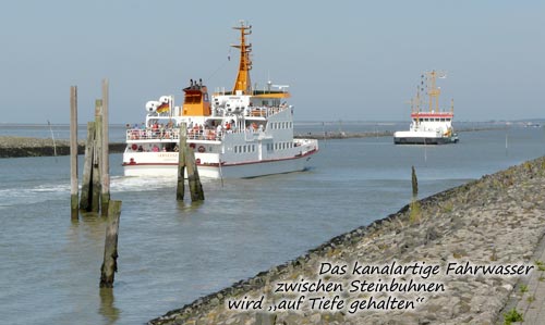 Ein Priel, der ständig auf Tiefe gehalten wird, kann von den Fährschiffen bei allen Tidephasen befahren werden.