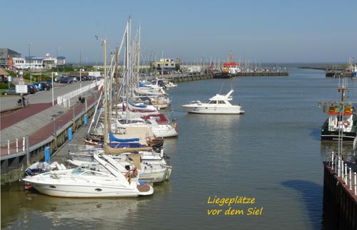 Eine weitere Liegemöglichkeit von etwa 30 Booten besteht dort, wo der Hafen vor dem Siel endet auf der rechten Seite.