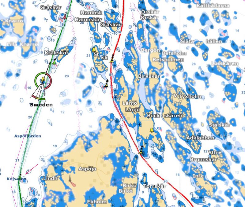 Die eingezeichnete grüne Route ist das Hauptfahrwasser im Aspöfjärden, die östlichere rote Route ist der Kronleden. Das Wasser dort ist tief und rein und ohne Überraschungen. Die Orientierung fällt anhand der zahlreichen Baken an Land leicht. | Die eingezeichnete grüne Route ist das Hauptfahrwasser im Aspöfjärden, die östlichere rote Route ist der Kronleden. Das Wasser dort ist tief und rein und ohne Überraschungen. Die Orientierung fällt anhand der zahlreichen Baken an Land leicht. | ||