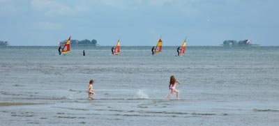 [[Datei:Windsurfen.jpg|left|framed|Die Bedingungen zum Surfen sind hier ganz gut. Weiter im Westen gibt es einen wahren Hotspot, auch für Catamaran-Segler. Im HIntergrund die Warften von Langeneß, die bei mäßiger Sicht wie ankernde Schiffe aussehen.]] | |||