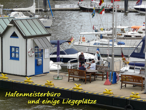 Deutlich sichtbar an der Basis der Anlege befindet sich das Hafenmeisterbüro.