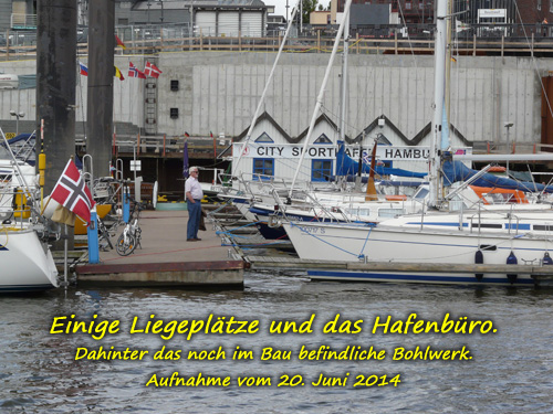 Vor der Kehrwiederspitze mit einem charakteristischen spitz zulaufenden Bau darauf und dahinterliegend die im Bau befindliche Elbphilharmonie biegt man links ein und fährt auf Höhe eines Feuerlöschbootes nochmal links in den Sportboothafen ein. | |||
