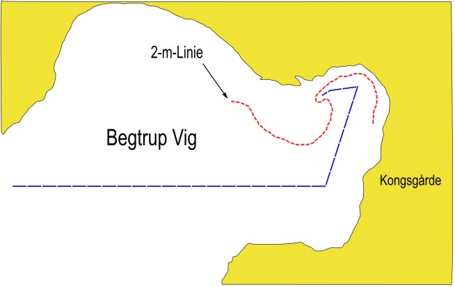 Die Untiefen sind nicht gekennzeichnet. Es ist also besser, gut Abstand zu halten. Der Kurs von Aarhus mit fast 090° auf das Steilufer von Kongsgårde zu ist auf jeden Fall sicher. Kurz vor Erreichen des Ufers dann mit 015° in die Bucht, und in deren Mitte dann mit langsamster Fahrt und Blick aufs Echo nach Westen pirschen zum Ankerplatz. | Die Untiefen sind nicht gekennzeichnet. Es ist also besser, gut Abstand zu halten. Der Kurs von Aarhus mit fast 090° auf das Steilufer von Kongsgårde zu ist auf jeden Fall sicher. Kurz vor Erreichen des Ufers dann mit 015° in die Bucht, und in deren Mitte dann mit langsamster Fahrt und Blick aufs Echo nach Westen pirschen zum Ankerplatz. | ||