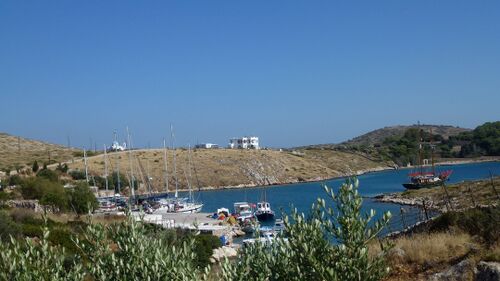 Der kleine Hafen hat eine Betonpier an der rk angelegt werden kann. Im Juni 2012 lagen hier einige Fahrtensegler. Im Ort gibt es 2 Tavernen, aber keine Einkaufsmöglichkeit. Wir waren direkt in der ersten Taverne, haben dort sehr gut gegessen und uns auch mit Eis für den Kühlschrank versorgen können. Für 3€ kann man im Ort duschen. Bei den kleinen Fischerbooten gibt es einen Wasserhahn, aus dem aber kein Trinkwasser fließt. [1]