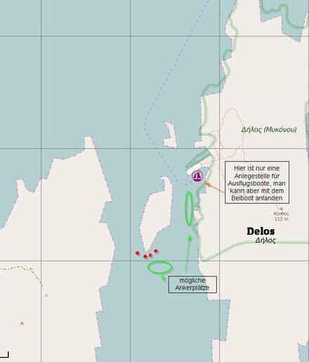 Die oben angegebenen Koordinaten beziehen sich auf die Anlegestelle, die zumindest in der Urlaubssaison vollständig für die Ausflugsschiffe freigehalten wird. Als Segler bleibt einem in der Regel nur einen Ankerplatz im Schutz der zwischen Delos und Rineia gelegenen kleinen Inselchen Remmati zu suchen, was in dieser oft starkwindigen Gegend nicht immer einfach ist. Der Ankergrund ist gut haltender Sand, wenn man einmal einen Fleck frei von Seegras gefunden hat. Bei nördlichen Winden liegt man meist neben der südlichen der beiden Remmati´s. Bei der Ansteuerung achte man auf die vorgelagerten Klippenfelder, der teilweise große Andrang an Ankerliegern und den naturgemäß recht souverän manövrierenden Ausflugsbooten und -schiffen erfordern dann einige Umsicht. Einmal vor Anker liegend - eine Ankerwache sei dringend empfohlen - kann man mit dem Beiboot zur Anlegestelle fahren und dort an der Kasse die weiteren "Formalitäten" erledigen.