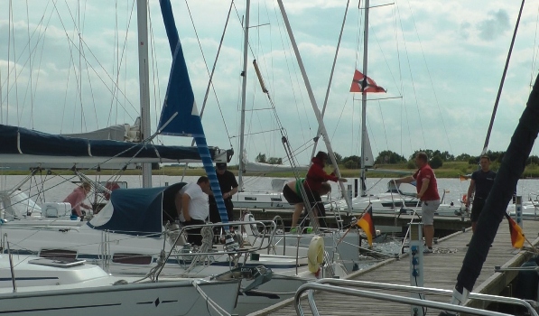 Im Hafen wird es an der Außenseite (südlich) des Stegs schnell flach, deshalb nahe am Steg bleiben. Die kleinen grünen Tonnen beachten. Man könnte sie auch für die Ankerbojen der Angelboote halten, die allerorten im Bodden zu sehen sind. Es sind aber Stb-Fahrwassertonnen, die man einlaufend tunlichst auch auf der grünen Seite lassen sollte. Die östlichen Liegeplätze sind deshalb etwas "anspruchsvoll" anzulaufen. Die Tonnen werden offensichtlich außerhalb der Segelsaison eingezogen.
