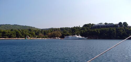 Die erste Bucht westlich der weiten Zufahrt zum Ort Skiathos. Die besten Liegeplätze bei Meltemi werden von Dauerliegern an Murings beansprucht. Vor dem Strand wäre der Schutz gut, aber zum Ankern bleibt so auf dem schnell abfallenden Grund nur ein verhältnismäßig kleines Fleckchen.