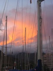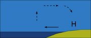Nachts entsteht ein thermisches Hoch über dem ausgekühltem Land. Das hat schwachen Wind zum Meer hinaus zur Folge. (Erstellt mit Inkscape für SkipperGuide)