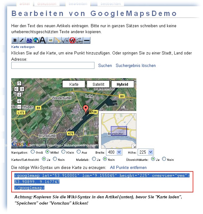 Der erzeugte Code <googlemaps>...</googlemaps> muss dann in das Bearbeitungsfenster an die entsprechende Position kopiert werden.