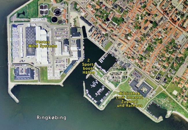 In Ringkøbing öffnen sich an Stb. zwei Sportboot-Hafenbecken, wobei der 2. der nähere zur Stadt ist.