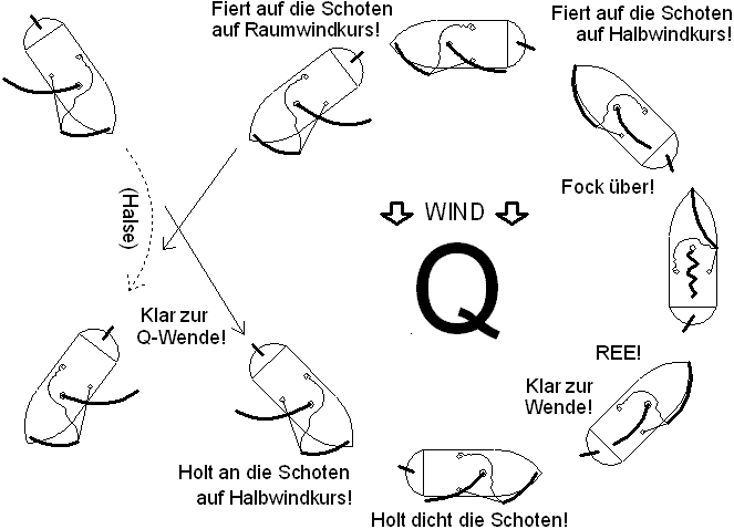 Bei einer Q-Wende steuert man also nicht nach Backbord, sondern nach Steuerbord und luvt an, bis man am Wind segelt. Dann folgt eine klassische Wende, und man fällt ab, bis man wieder vor dem Wind segelt, der jetzt von Backbord kommt. Dabei wird ein Winkel von 270° statt nur 90° beschrieben. Die Q-Wende dauert also deutlich länger als eine Halse, vermittelt in manchen Situationen aber ein deutlich besseres Sicherheitsgefühl.