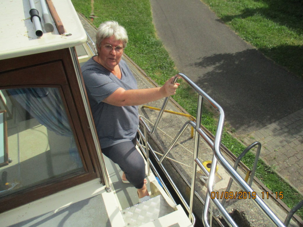 Der IO auf der Cezanne, ein wirklich sehr nettes Mädchen, hier bei der Schleusenarbeit, aber auch sonst wurden von ihr alle seemännischen Arbeiten einwandfrei, neben der Pantry, erledigt. Wir hatten immer über die Mittelklampe/POller gefiert und uns das Ausbringen von zwei Leinen erspart. Allerdings muss man immer darauf achten, dass sich nichts bekneift, einmal war dies trotz aller Vorsicht der Fall und das Boot hat sich etwas aufgehängt, bis die Leine gerissen ist. In solchen Fällen muss sofort die rote Stange gezogen werden.