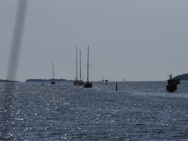 Das ist einsamer Rekord: 28 Meilen unter Motor! Den ganzen Tag regte sich kein Lüftchen, Spitzenwindgeschwindigkeit 1,9 m/s. Und so schraubte sich dann ein Pulk sogenannter Segelyachten, zeitweise 8 Boote, gemeinsam gen Norden. Kalmar kam in Sicht, und hier bogen alle ab.