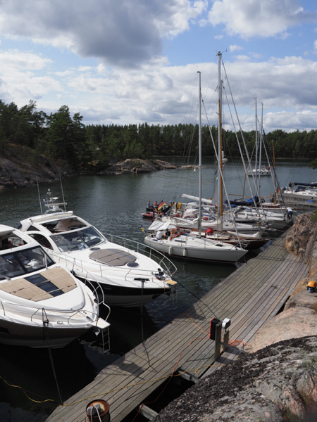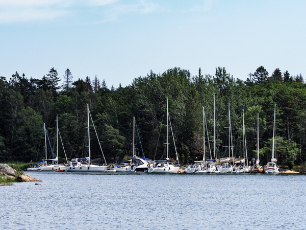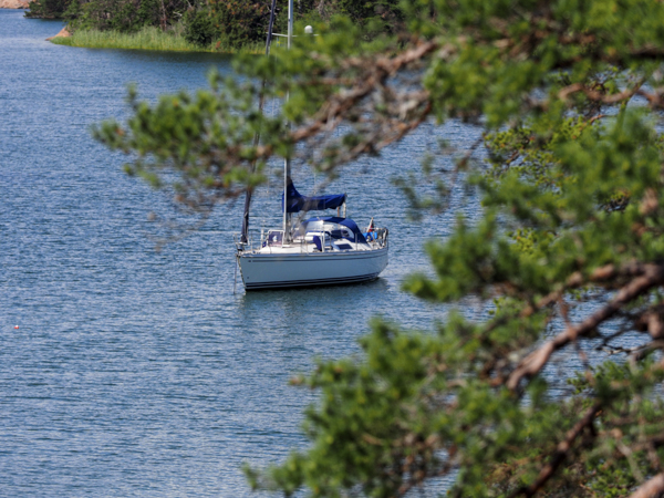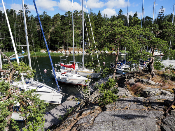 Heute dann endlich weiter! Es ist trocken, der Wetterbeicht spricht von Süd 6 - 9 m/s. Es wurden 10 - 13 m/s und aus Südsüdwest, allerdings warm und mit Sonne. Wir haben nur die Genua ausgerollt und sind nach Westen gebritzt, immer am Südrand der Hanöbucht entlang. Immer, wenn man aus der Schärenabdeckung kam - und das war die meiste Zeit - stand da eine fast 2m-See aus der Hanöbucht. Unser Bootchen schnurrte aber sehr gemütlich durch, meist mit mehr als 6 1/2 kn. Und dann rechts ab, hinter die Felsen manövriert, Ruhe ist. Der Steg in Tjärö ist allerdings rappelvoll, ist wohl immer noch Saison. Wir fahren weiter um die Ecke in die östlich gelegene Bucht, und sind im Ententeich. Die Bäume rauschen wie verrückt, im Cockpit fast kein Lüftchen. Eine blaue Boje des SXK ist frei, also dort fest.