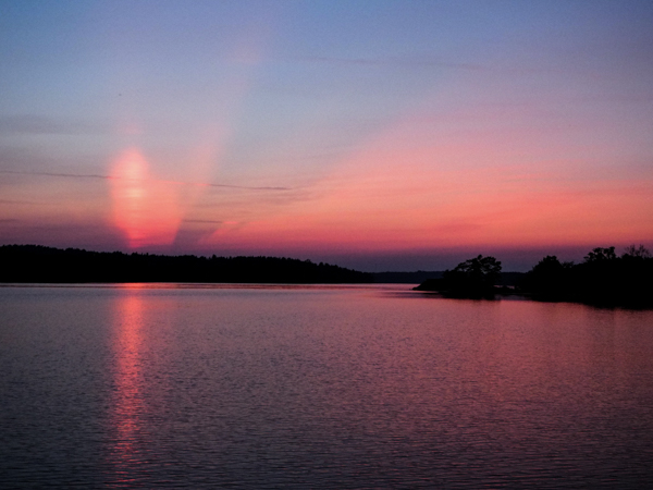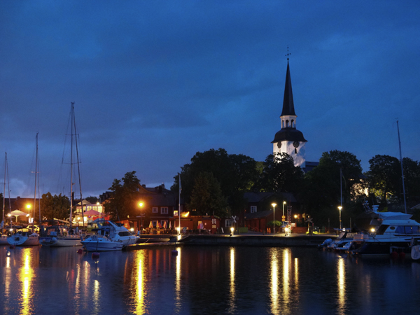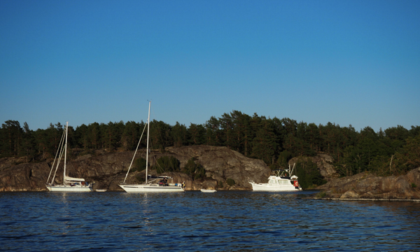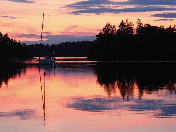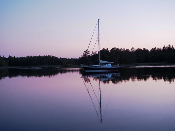 Am Vorabend gab es aber noch was Interessantes: In der Dämmerung kam noch ein Boot in die Bucht, steuerte schnurstracks auf uns zu. Wie lange wir denn noch an dieser Boje bleiben wollten? Bis morgen natürlich. Das ginge nicht, die Boje sei nur für Mitglieder des Kryssarklubben, wir müssten ablegen. Erst als wir ihm unsere Mitgliedsflagge zeigten, drehte er knurrend ab. Fuhr dann aber zu der anderen Boje, an der ein Holländer lag, und der war kein SXK-Mitglied, musste widerwillig das Feld räumen und ankerte dann neben uns. Was uns ein schönes Mondscheinfoto bescherte: