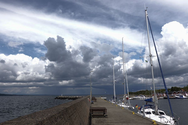 Die Wetterberichte machen uns Kopfzerbrechen. Die Tiefs, die da aus Westen anrauschen, werden auf einige Tage Sicht einen Schlag von Sandhammaren nach Westen verhindern. Aber jetzt eine Woche in Karlskrona bleiben? Nöö. Übder Hanö nach Simrishamn, was jetzt noch ginge? Dann sitzen wir eine Woche in Simrishamn. Auch Nöö. Frühstart und nach Ystad durchmotoren? Nöö, nöö, nöö.