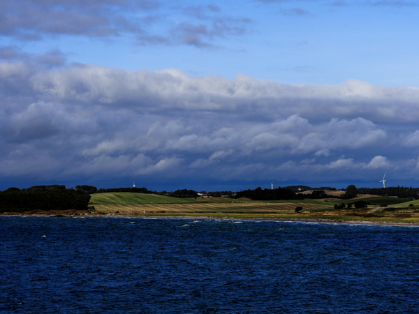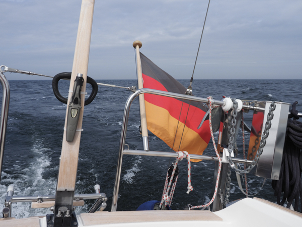 Uff, geschafft! Grüne Wiesen, Steilküsten, Rapsfelder - wir sind in Dänemark. Unter der Steuerbordsaling weht der Dannebrog, backbords die EU- Flagge.