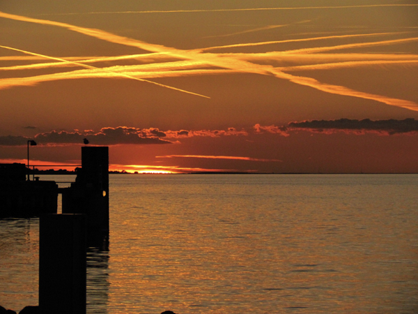 Der Abend ist grandios, aber irgendwie ist das Wetter nicht ganz vertrauenerweckend. Die Kondensstreifen über uns zeigen, dass da wohl ein regelrechtes Luftkreuz ist.
